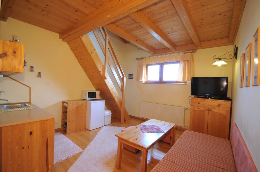 Dva apartmány sú zariadené komfortne a účelne. V pokroví apartmánu je spálňová časť , z ktorej sa Vám naskytne pohľad na panorámu Vysokých Tatier. Obývacia časť je prepojená s plne vybaveným kuchynským kútom. Apartmán má vlastnú kúpelňu. Apartmány sú ideálne pre 4-5 členné rodiny.